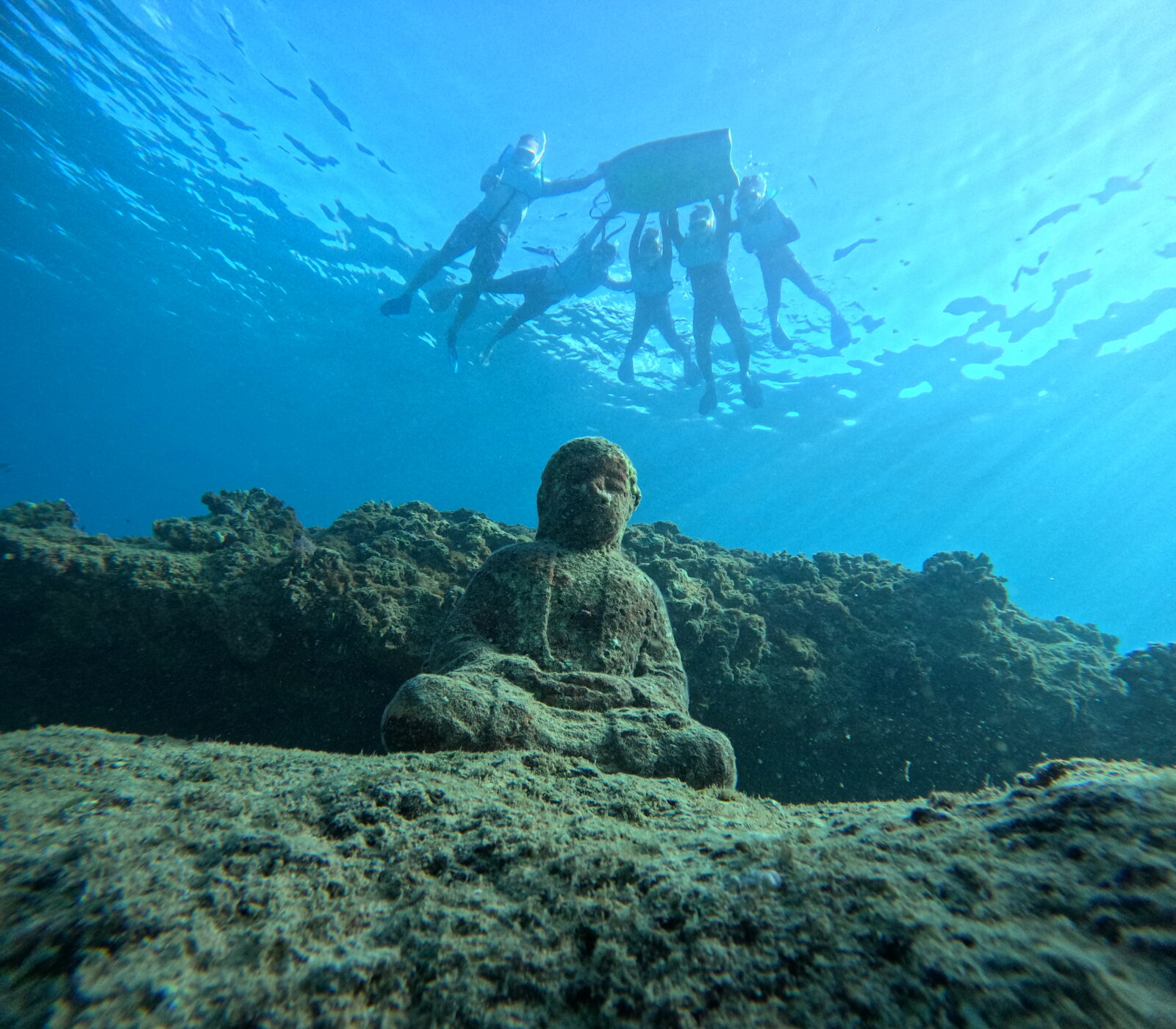 少し波のあるコンディションでしたが、浅瀬で練習を済ませたら、水中ブッタ様にご挨拶!
