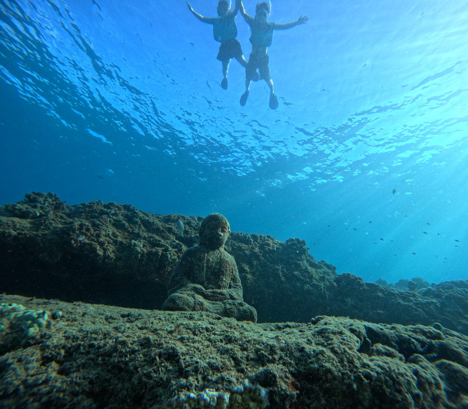 波もなく、シュノーケリング日和!シュノーケリング経験済みのお二人は、あっという間に水中ブッタ様にご挨拶!