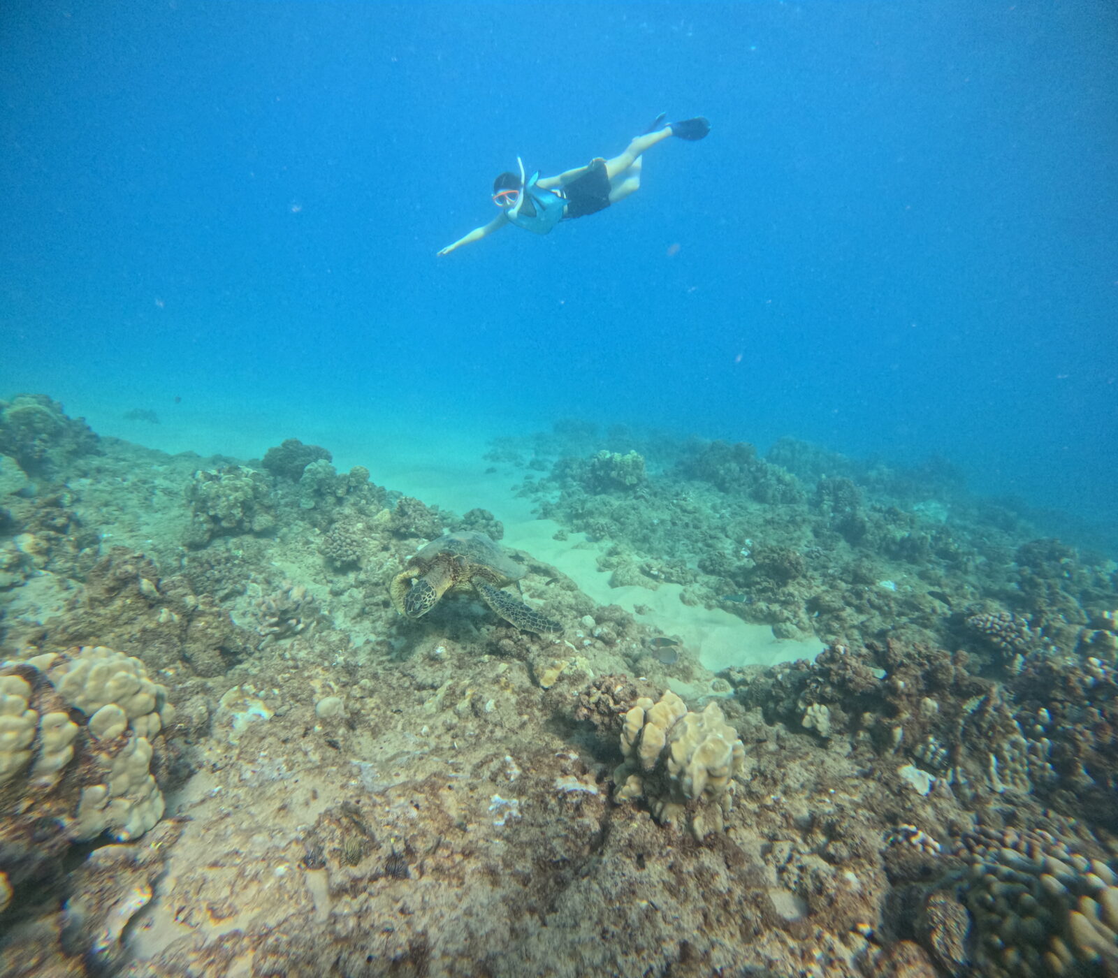 スキンダイビングにも挑戦してみたかった奥様は、水中ブッタ様や幸運を呼ぶホヌ様にダイブ!