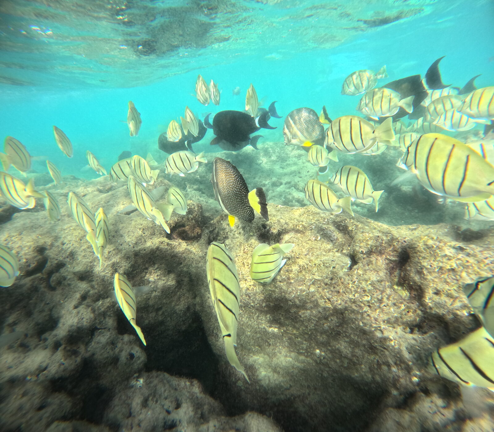 シュノーケリングほぼ初めてのご家族は、浅瀬での練習を済ませて水中を覗くと… シマハギの群れがお出迎えしてくれました!