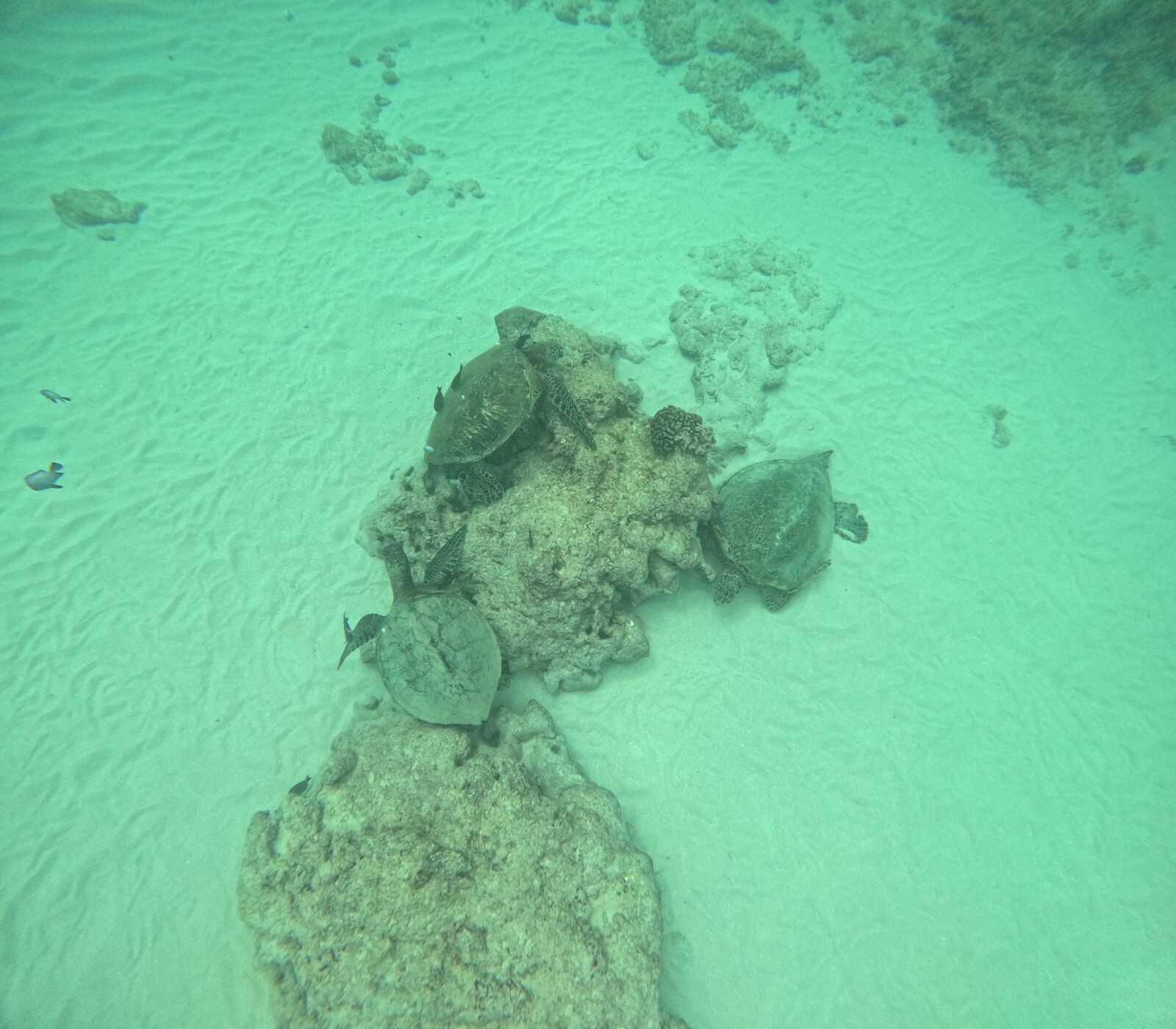お天気はイマイチでしたが、水中の透明度は抜群によく、10Mの水底でリラックスしているホヌ様が、水面から丸見え〜