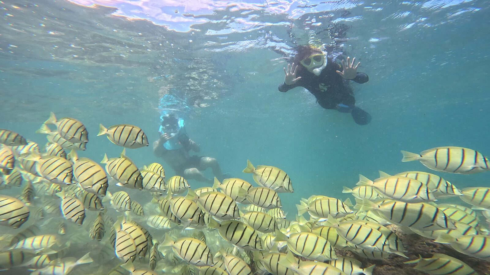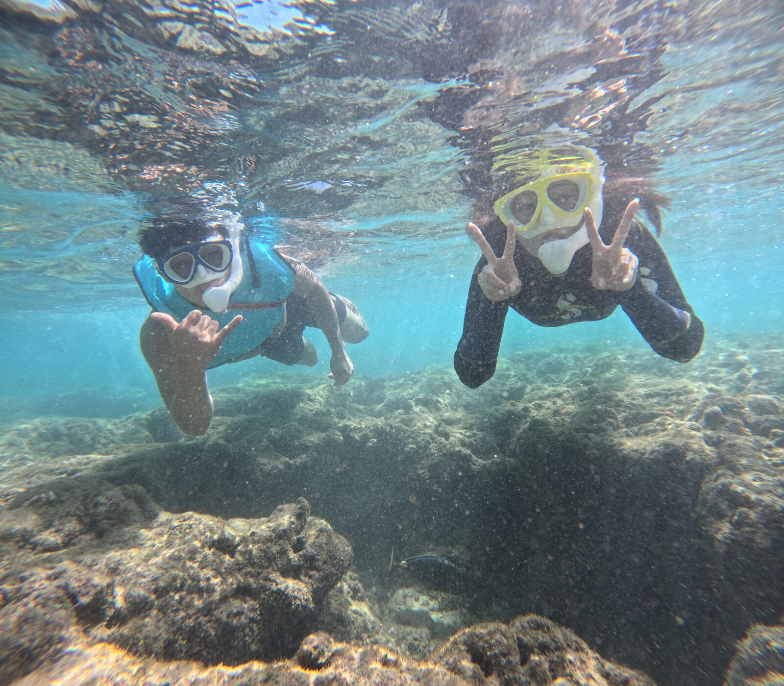 サーファーの旦那様とシュノーケリング経験者の奥様は、浅瀬で練習をしたらハナウマ湾の沖合へ!
