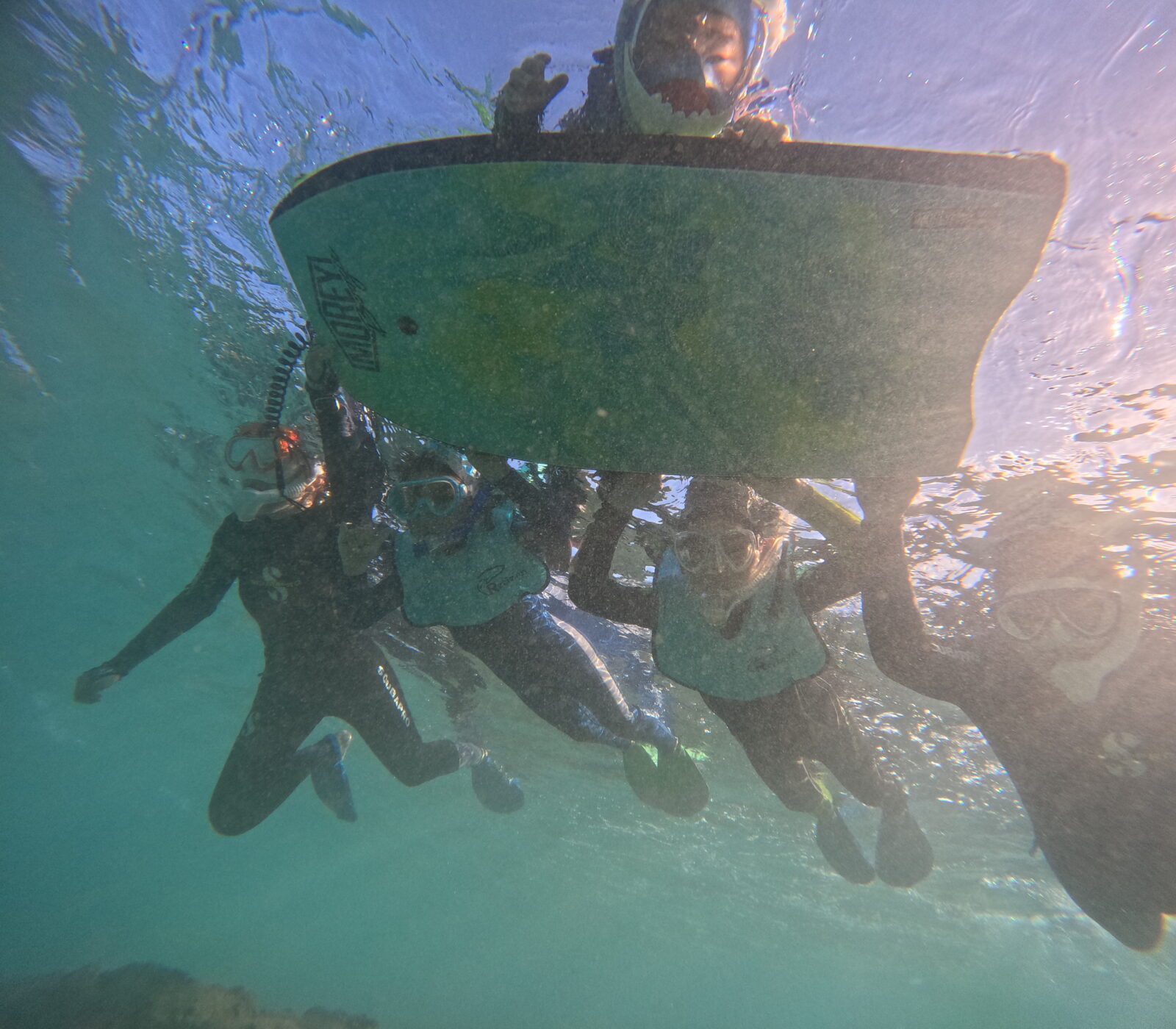 4歳末っ子くんは、ボードの上からフルフェイスマスクで参戦!6歳&9歳息子くんたちは、ボードに捕まって上手にできてます!