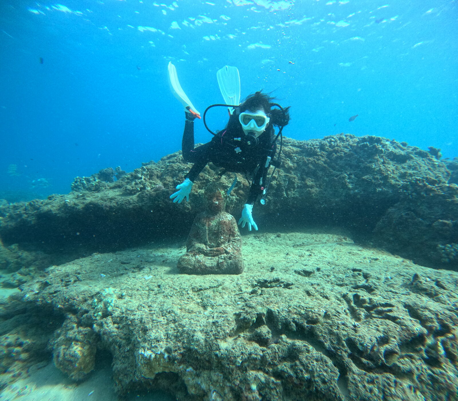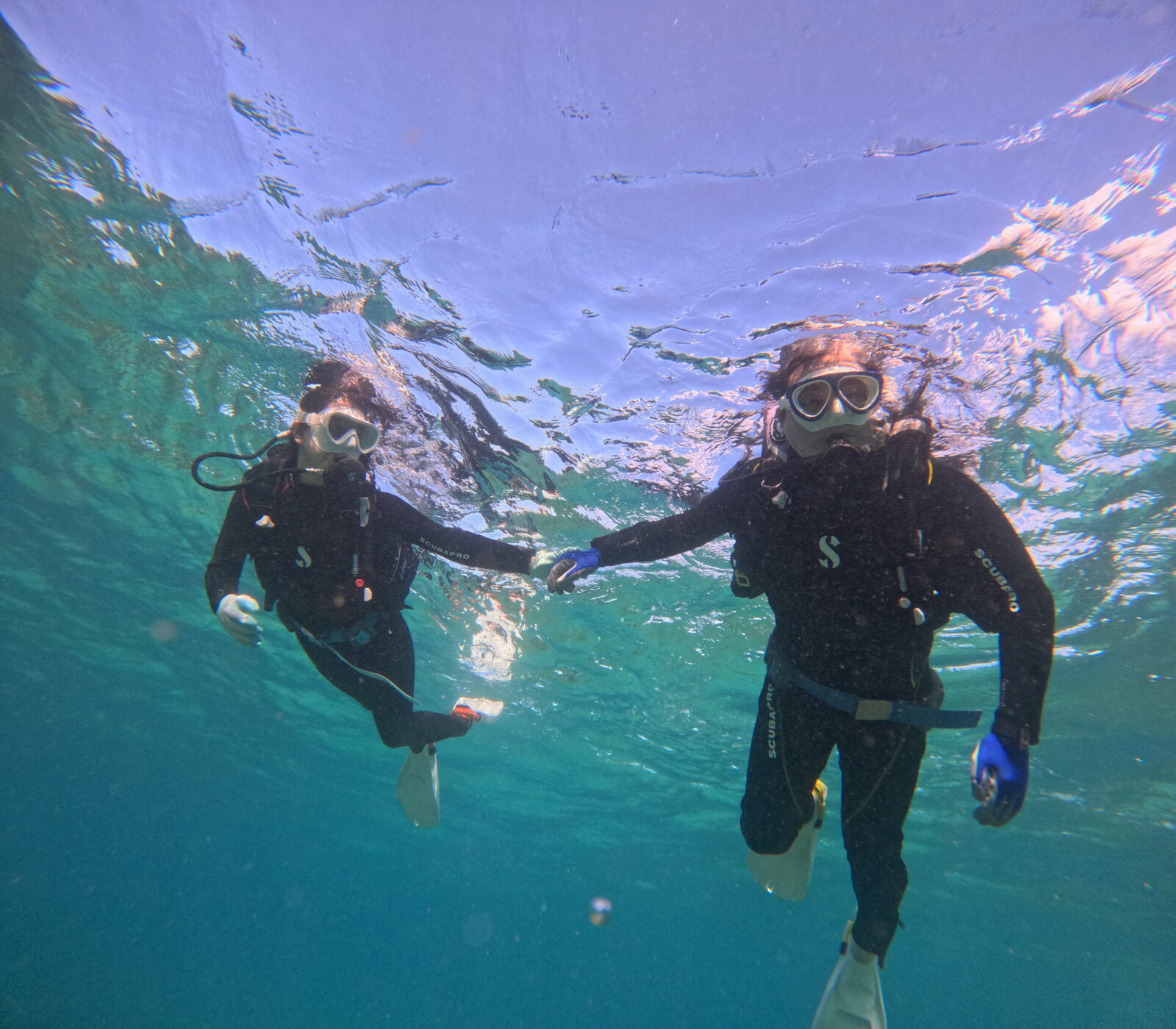 浅瀬で呼吸&耳抜きの練習をしたら、少し沖合にでて総仕上げ!ライセンス保持者の奥様が、初ダイビングの旦那様の手を引いてアシスト!