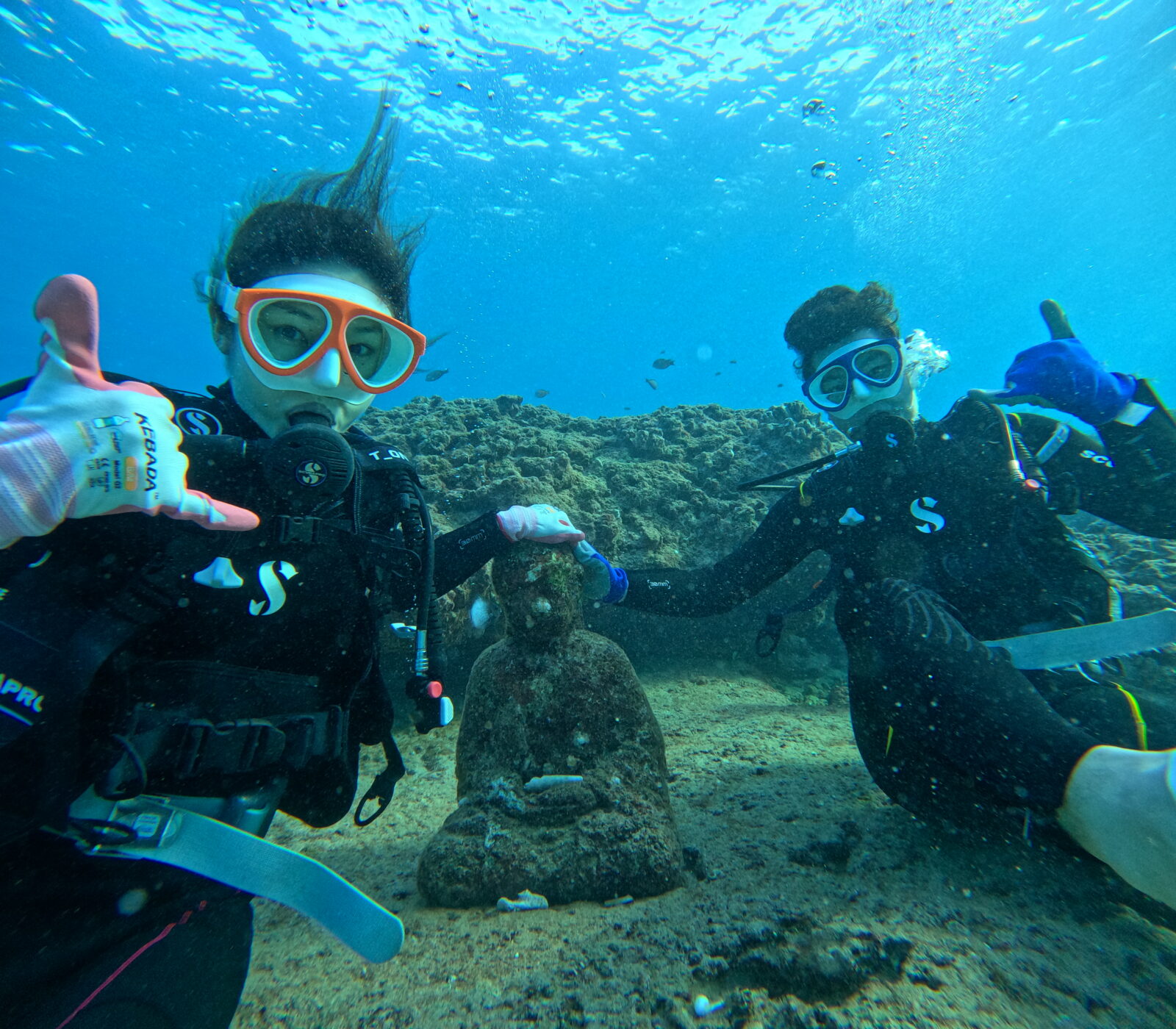 お二人ともダイビング経験したことがあるだけあり、呼吸&耳抜きもスムーズ!まずは水中ブッタ様にご挨拶!