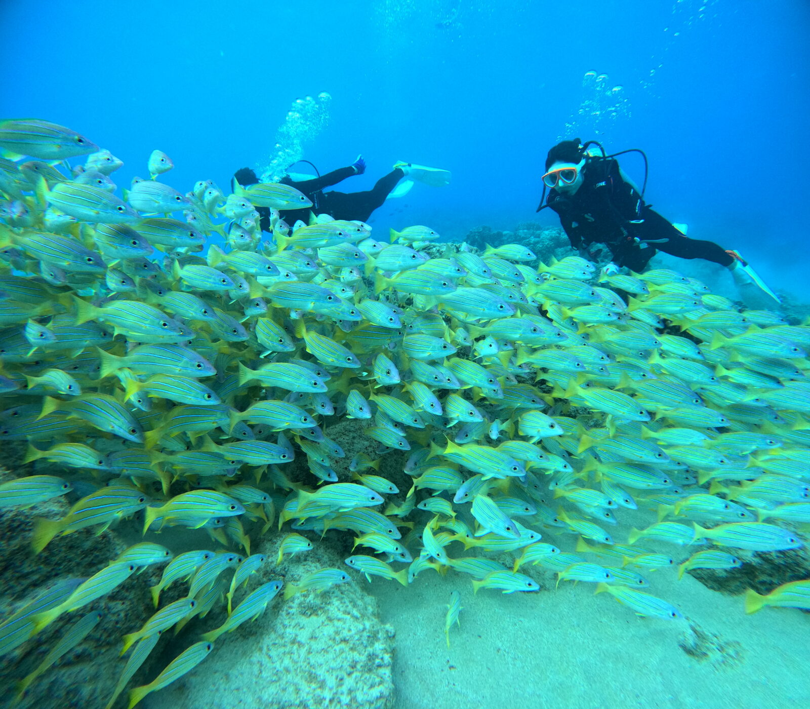 水底一面に広がるヨスジブエダイの大家族に混じって泳げました!