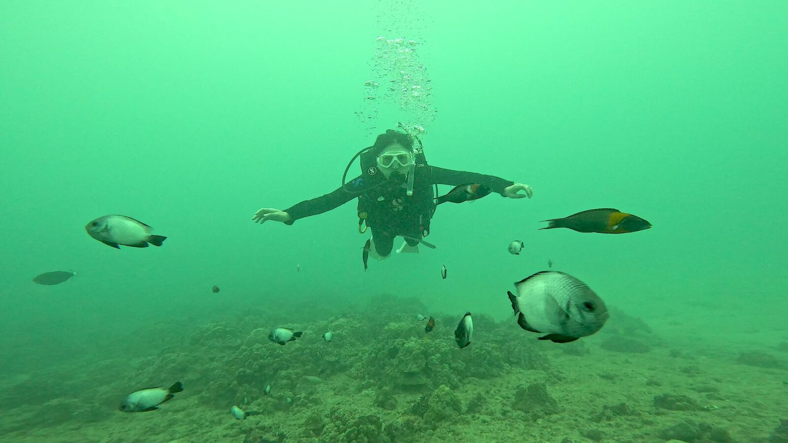 中性浮力を保ちながら、お魚たちと泳ぐ練習もしました!