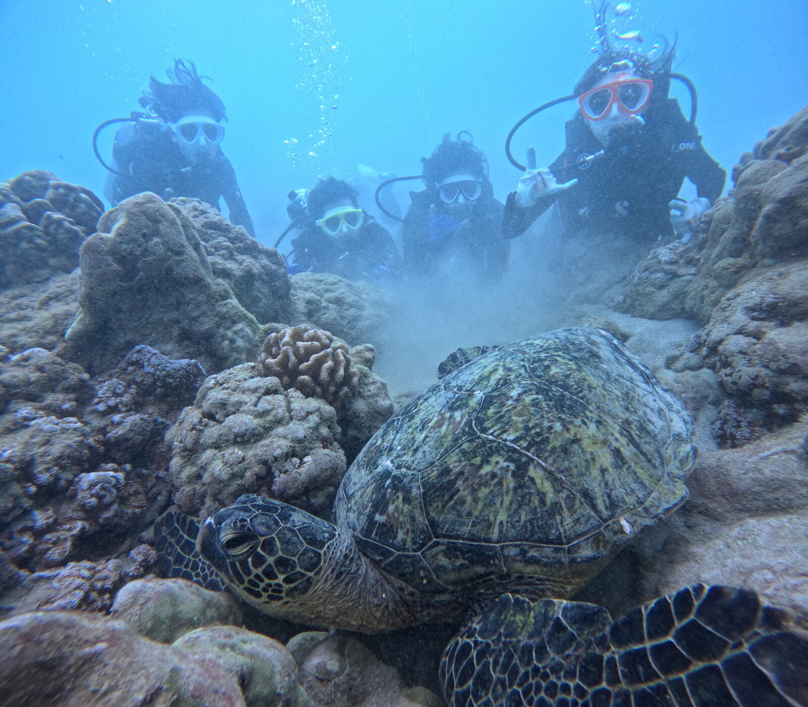 波、風、流れが少しあるコンディションで、透明度もそれほど良くありませんでしたが、ハナウマ湾の沖合ではホヌ様が待っていてくれました!