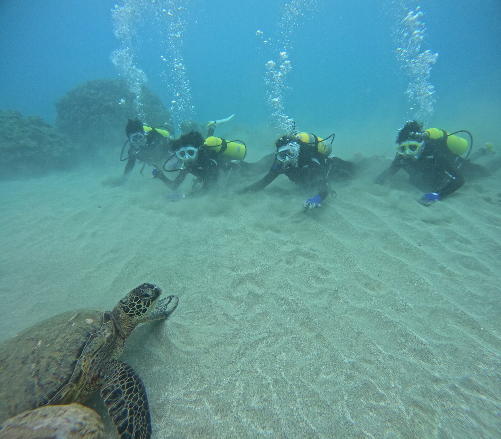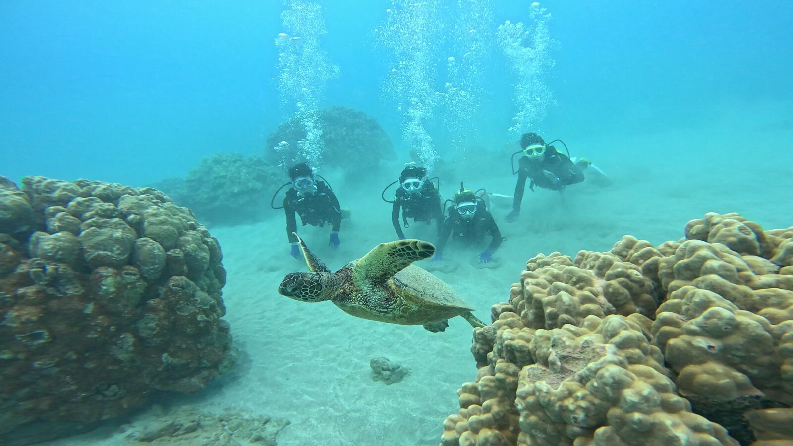 波&流れもなく、ダイビング日和!浅瀬で呼吸&耳抜きを習得したら、早速ハナウマ湾の沖合へ!幸運を呼ぶホヌ様探しへ、Let’s Go!!