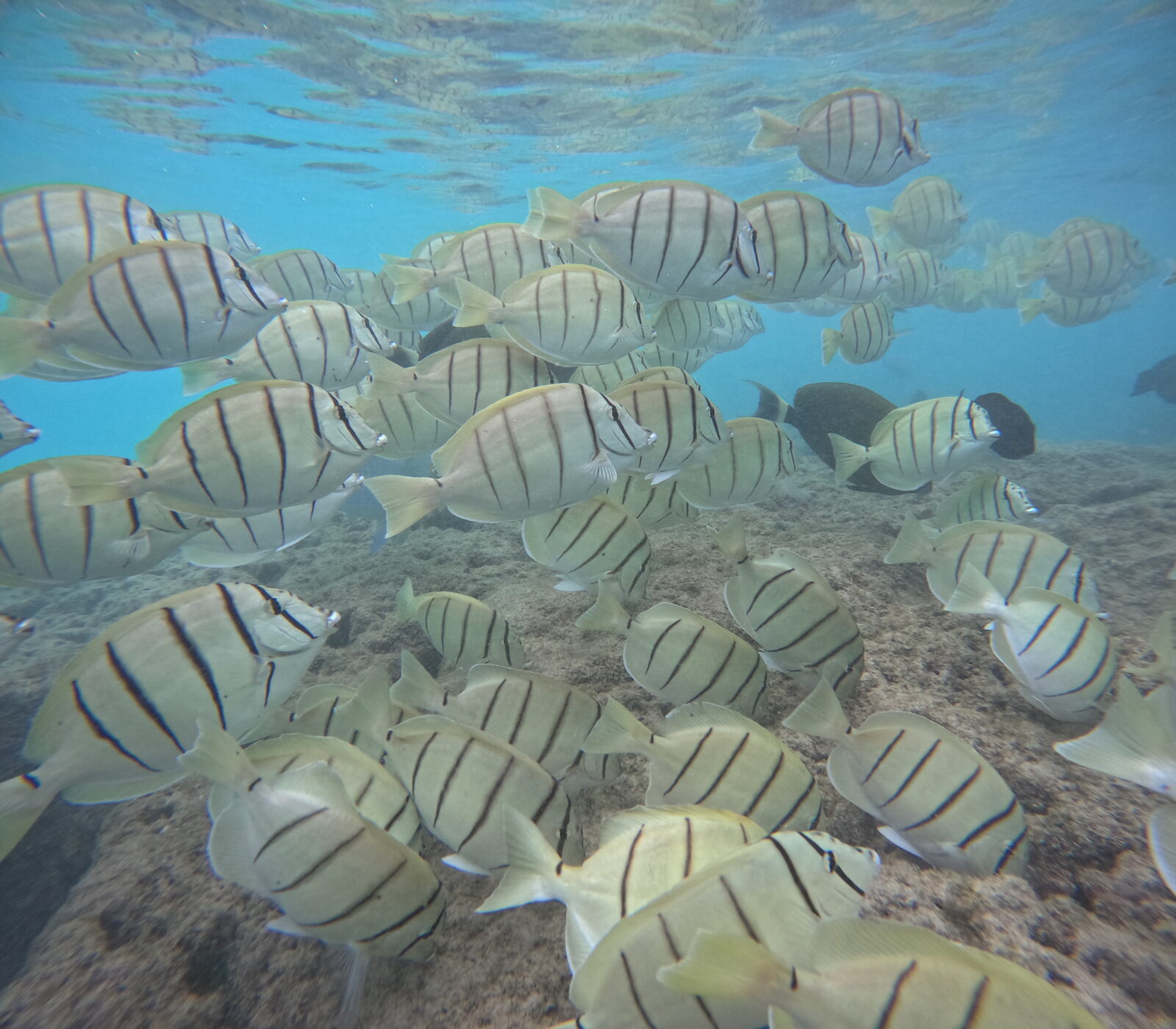 ブイに捕まりながら、ハナウマ湾の沖合でシマハギの群れに会えました!