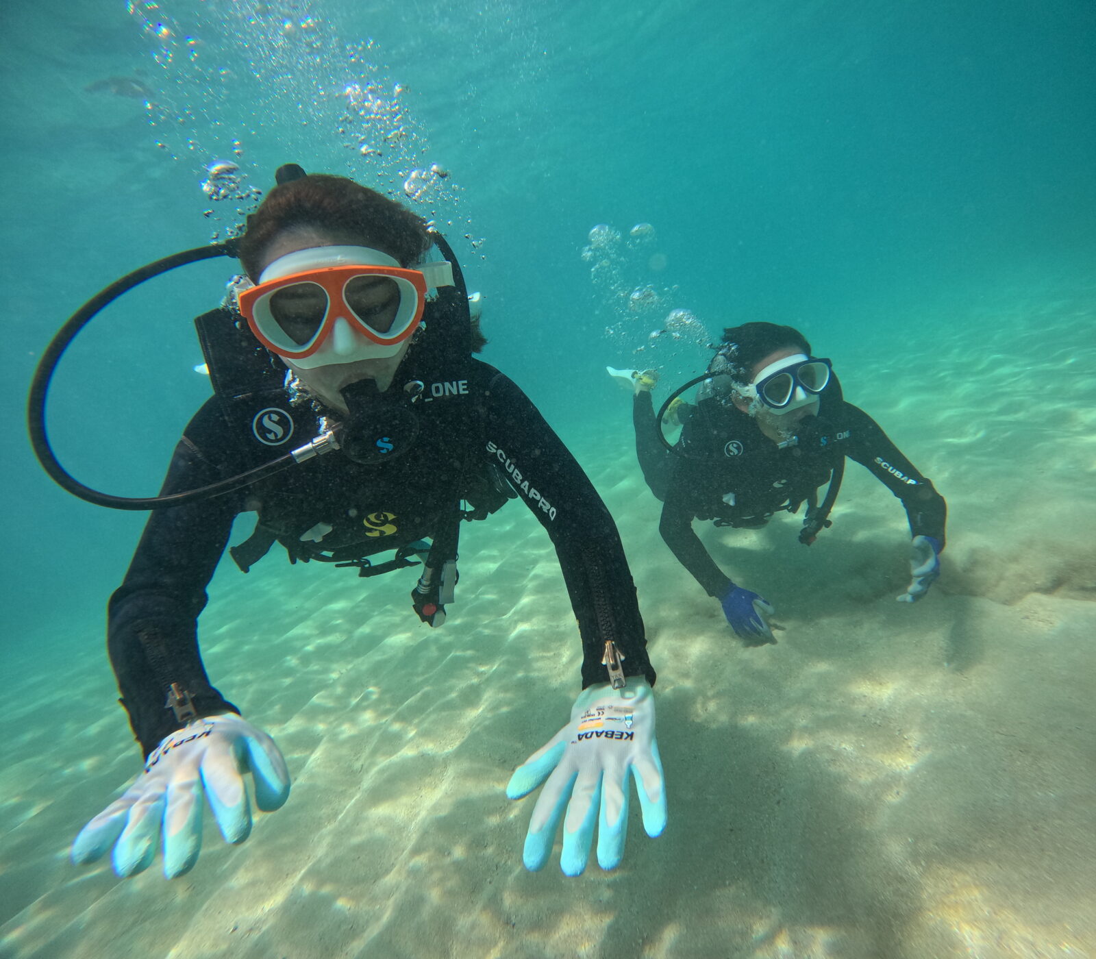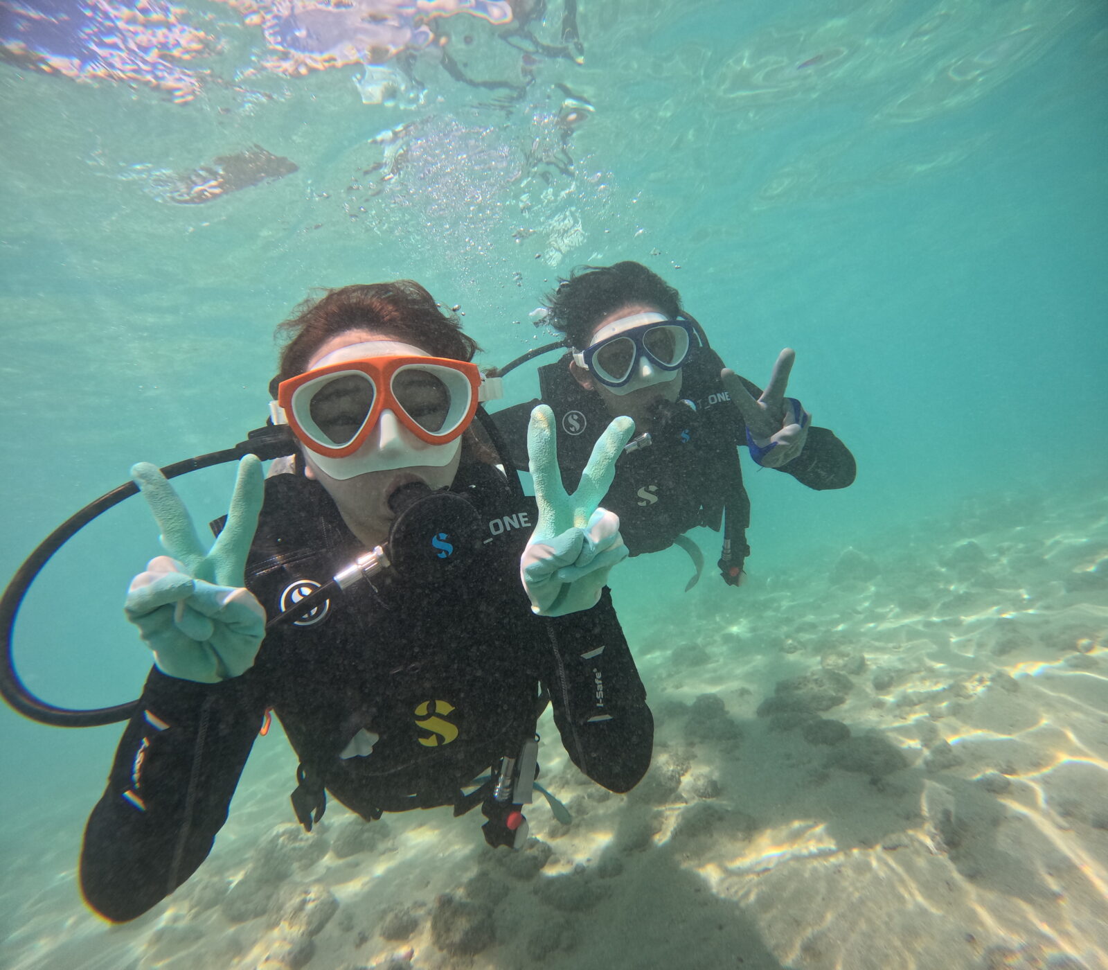 前回のダイビングで、耳抜きがうまくできなかったと言うことで、陸上のレクチャー&水中での練習は、時間をかけてゆっくりと習得していきます。