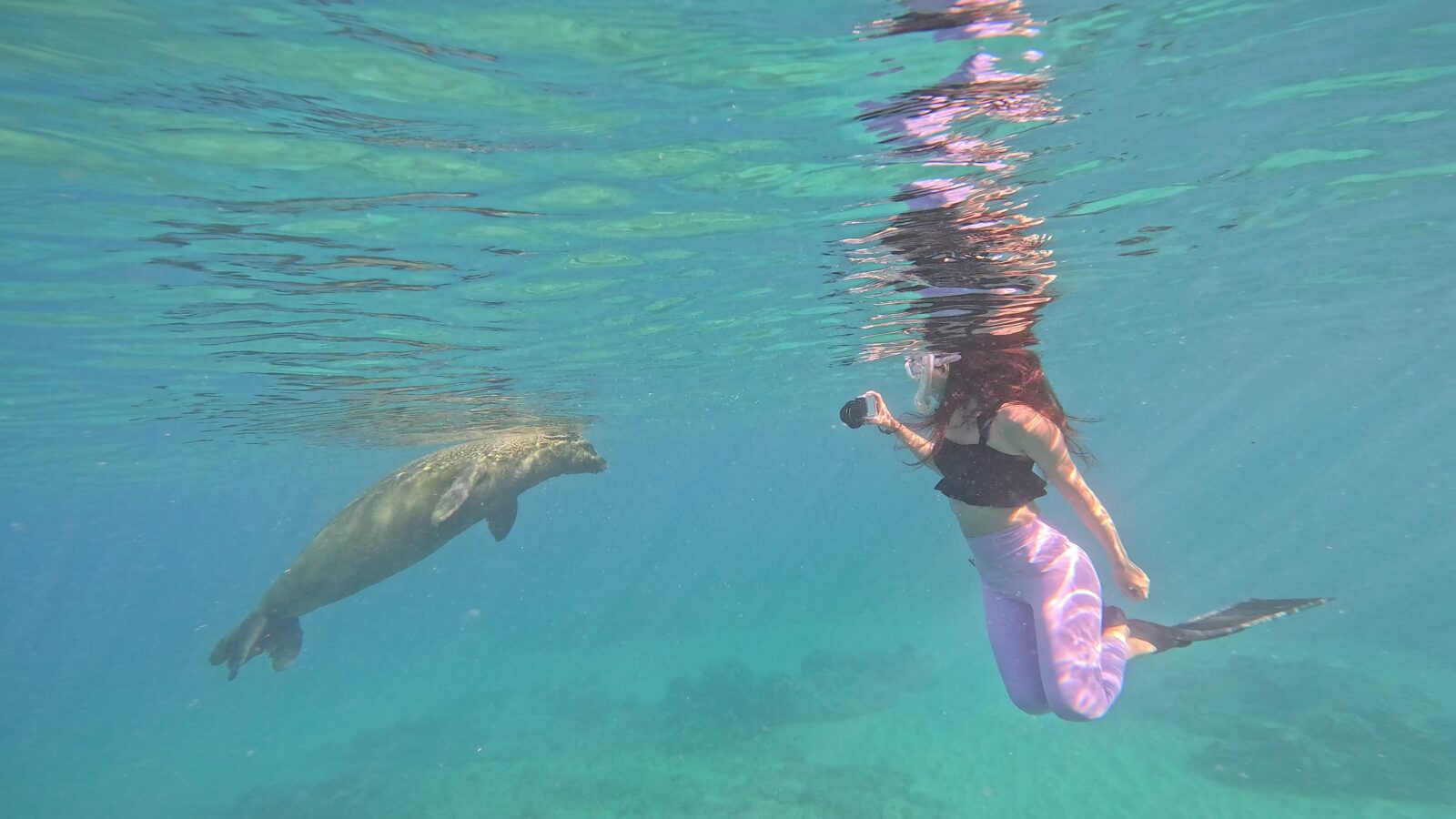 そして、水中で聞こえる鳴き声の方へ泳いでいくと… いました!ハワイアンモンクシール!去年も会えているので、絶滅危惧種との遭遇率100%のラッキーガール!