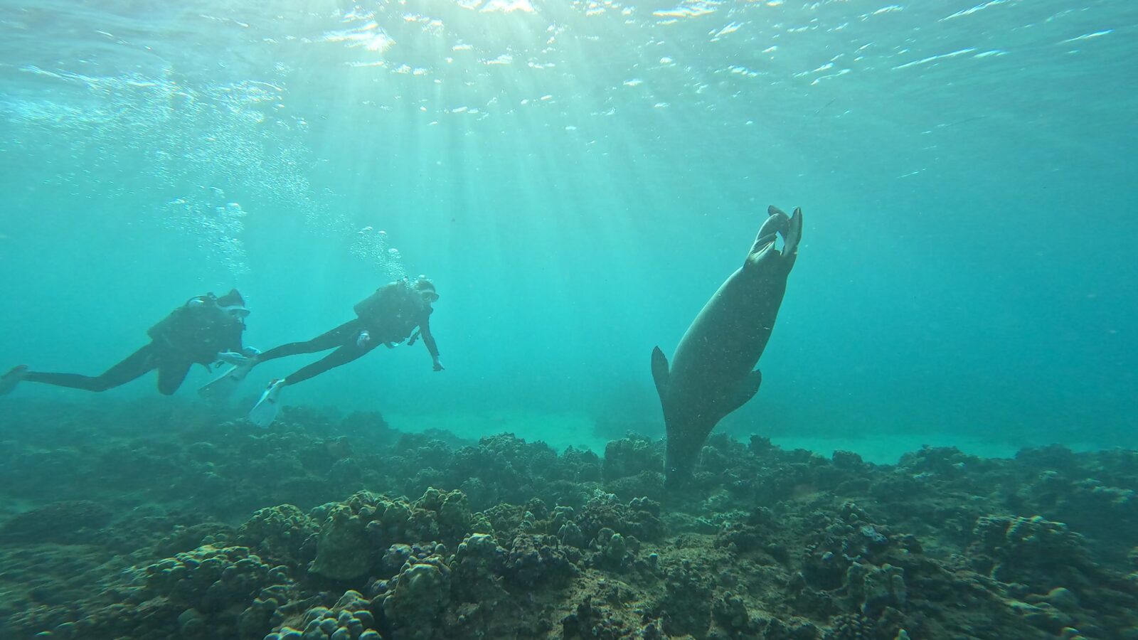 そして本日のハイライトは、絶滅危惧種ハワイアンモンクシール!逆立ちで餌を物色中の姿や…