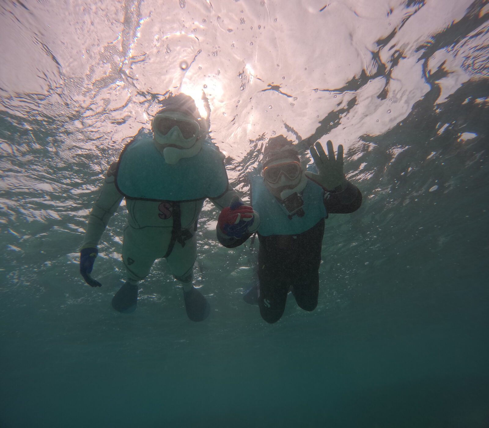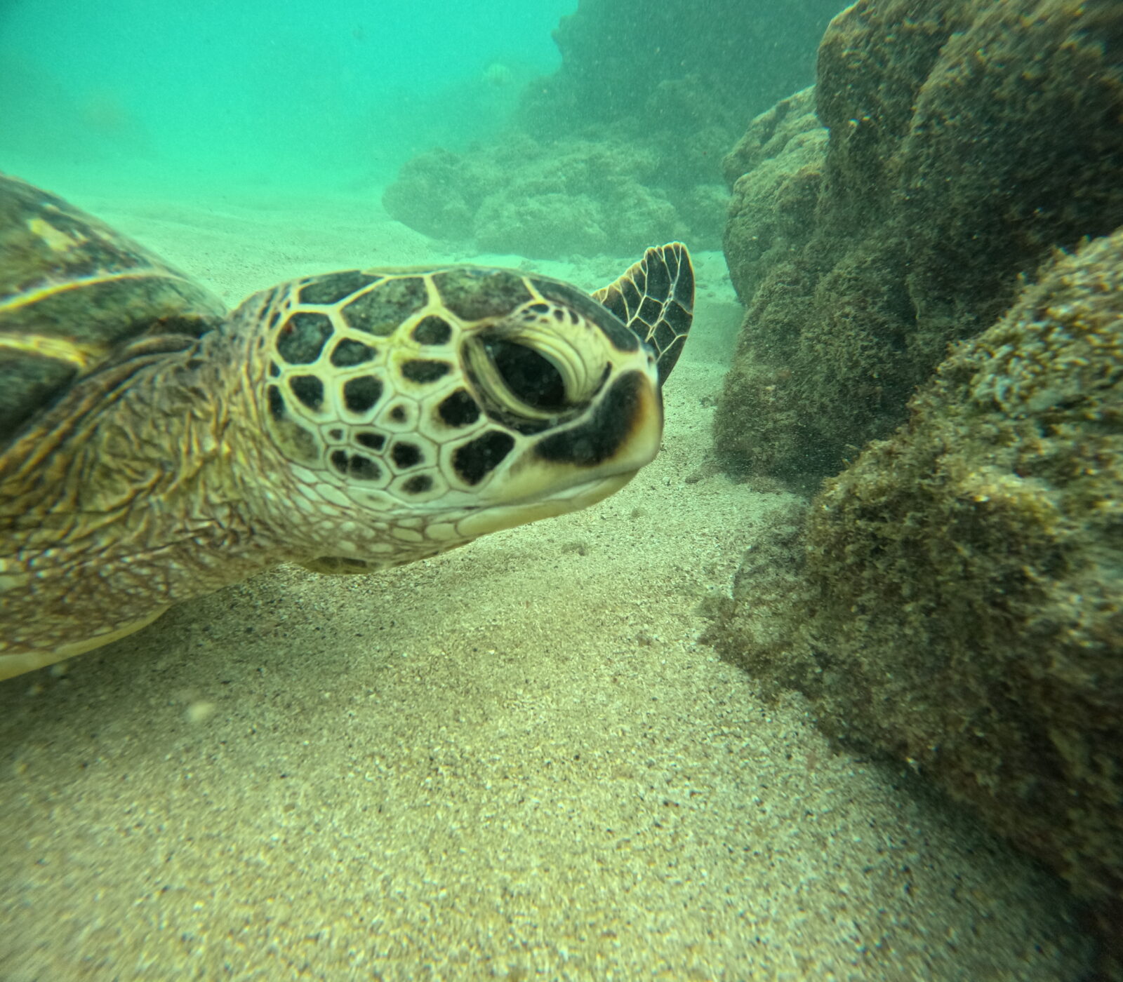 浅瀬で練習をしたら、シュノーケリングスタート!開始早々に、ご飯を食べているホヌ様に遭遇できました!