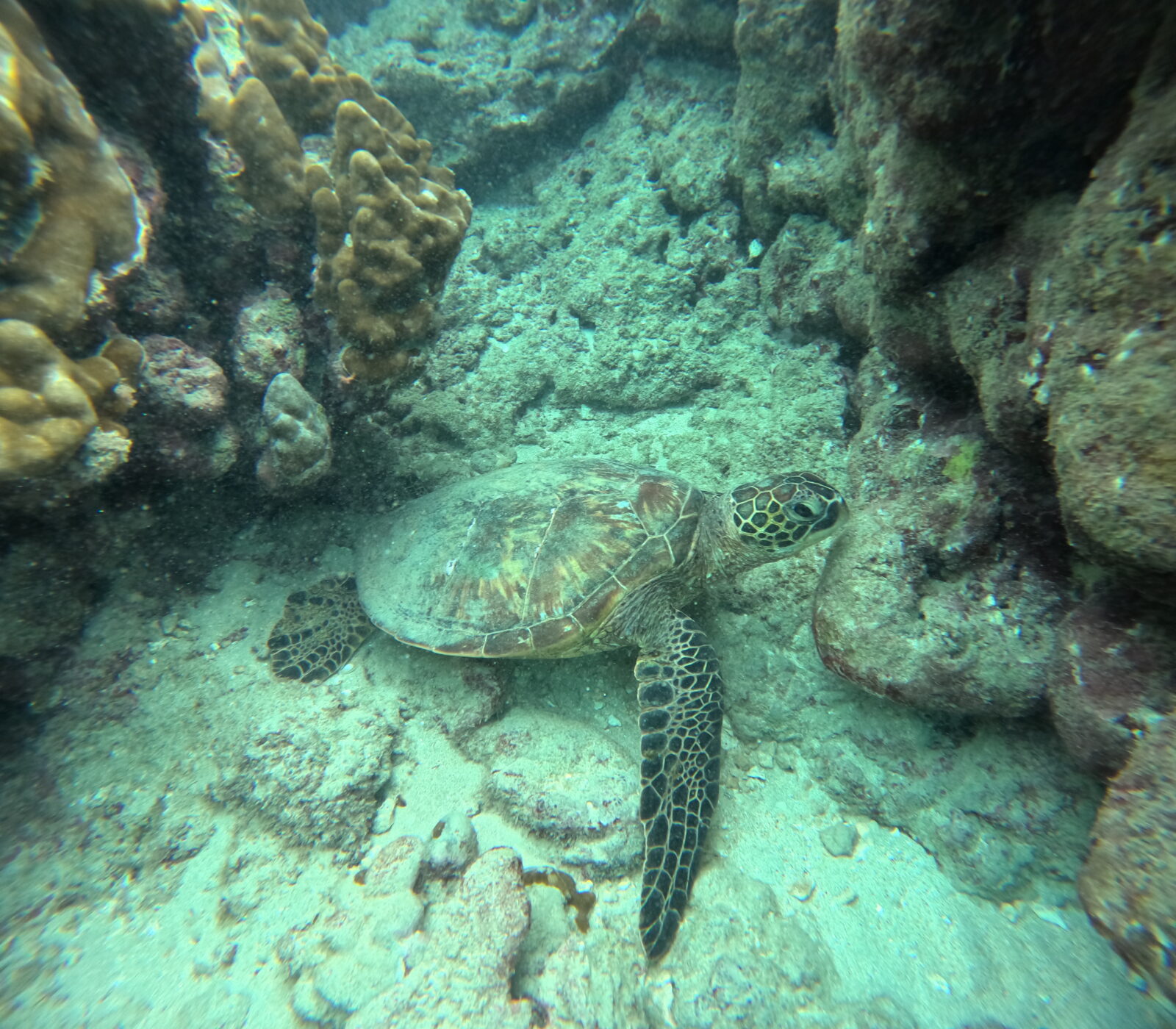 岩陰で休憩中のホヌ様に会えました!ラッキー!