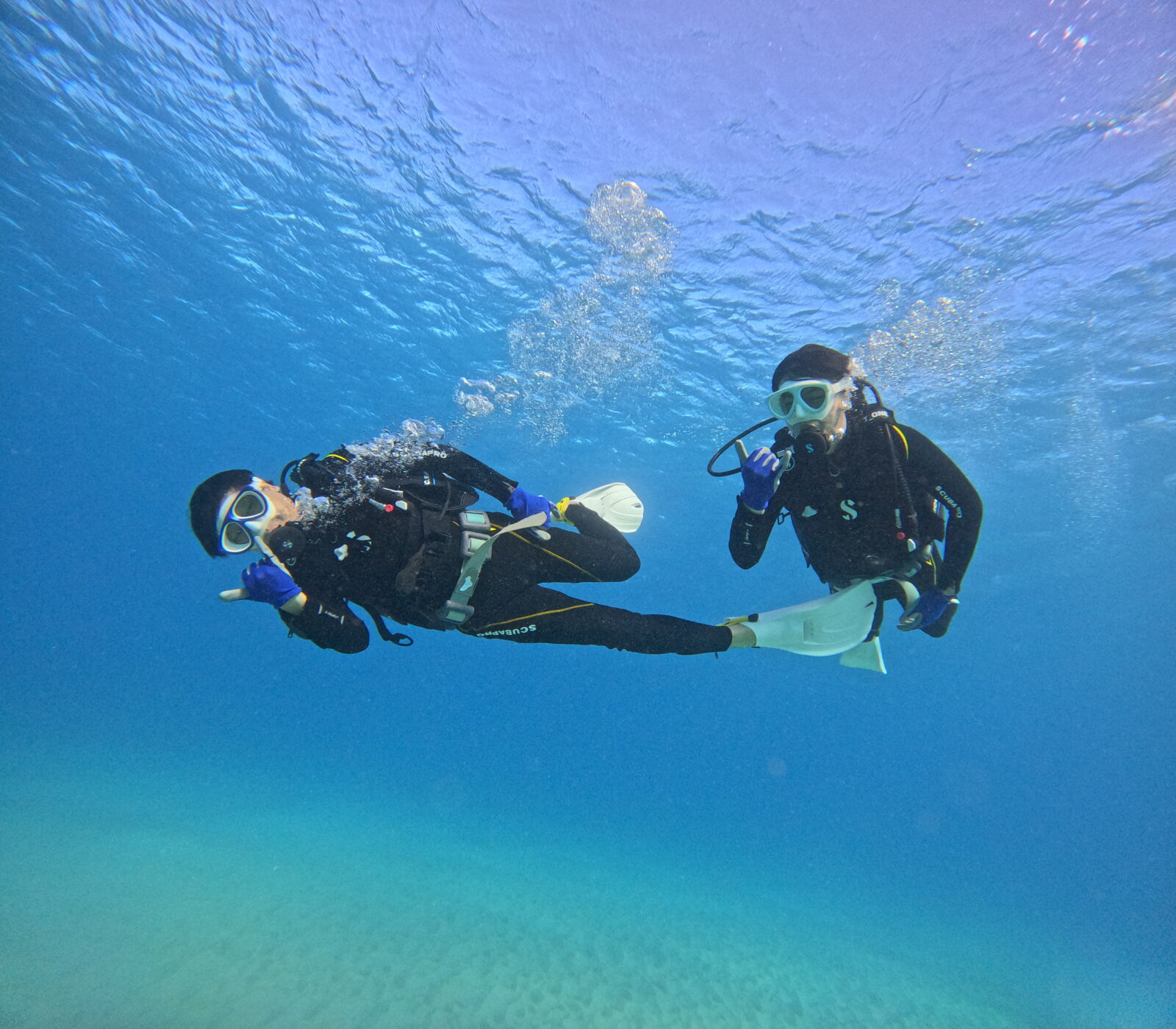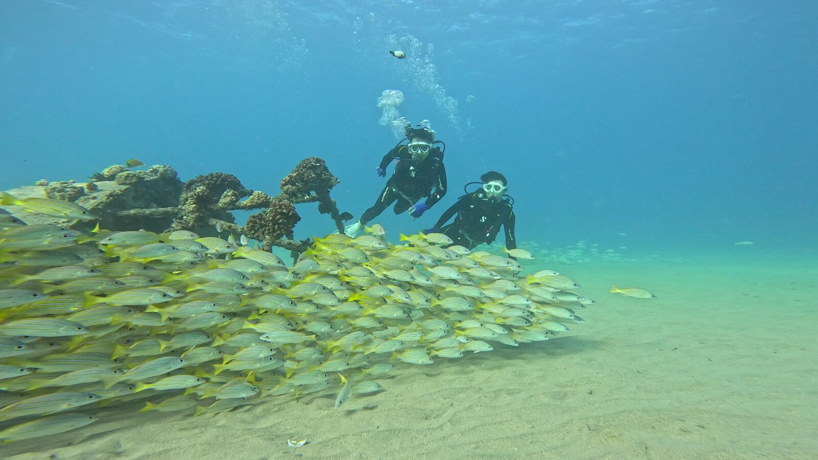 2年のぶりのダイビングでしたが、呼吸&耳ぬき、水中での泳ぎ方もとっても上手!ヨスジブエダイの大家族とダイブ!