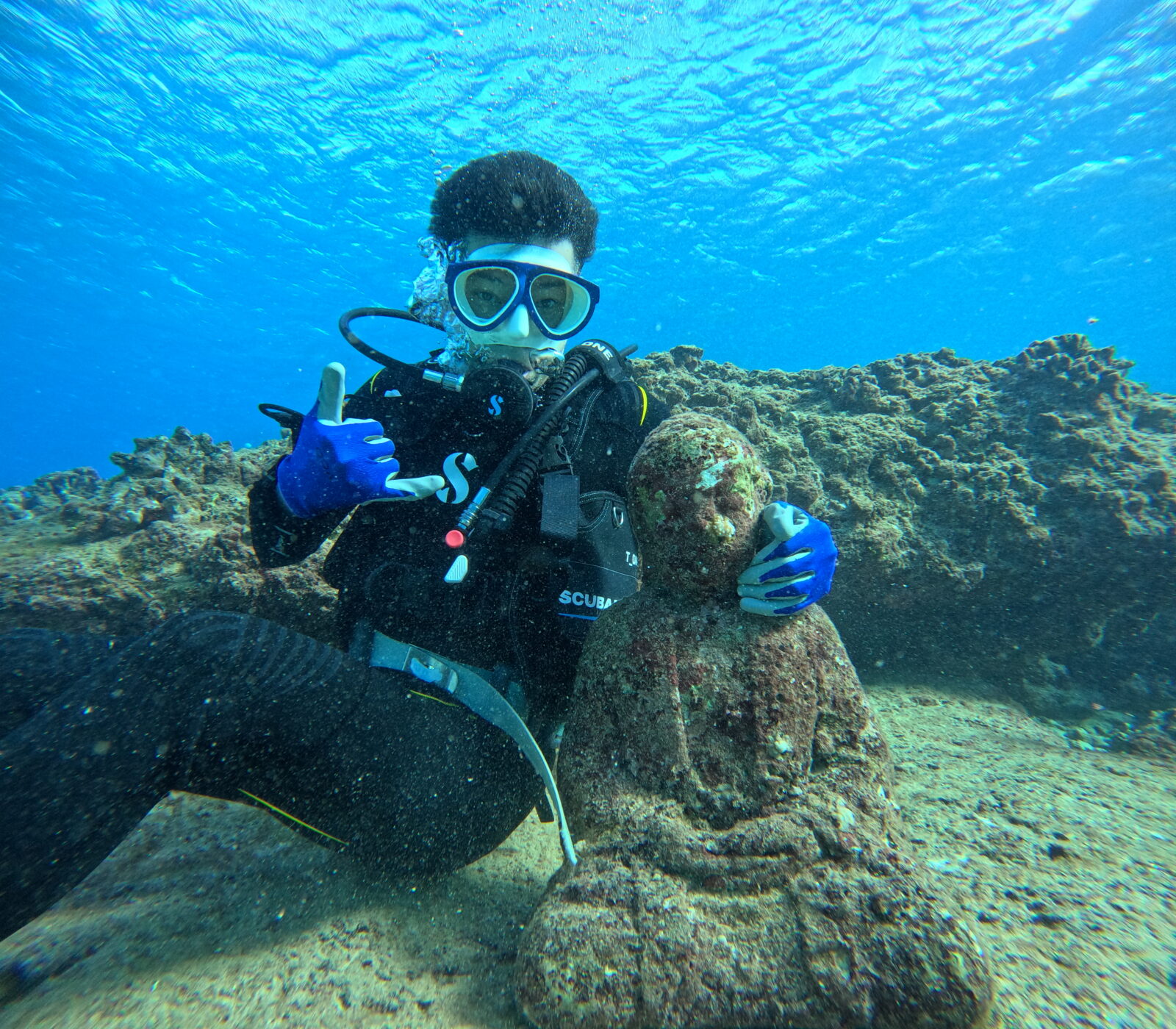 2ダイブ目ご希望の京都在住の旦那様は、水中ブッタ様と記念撮影!