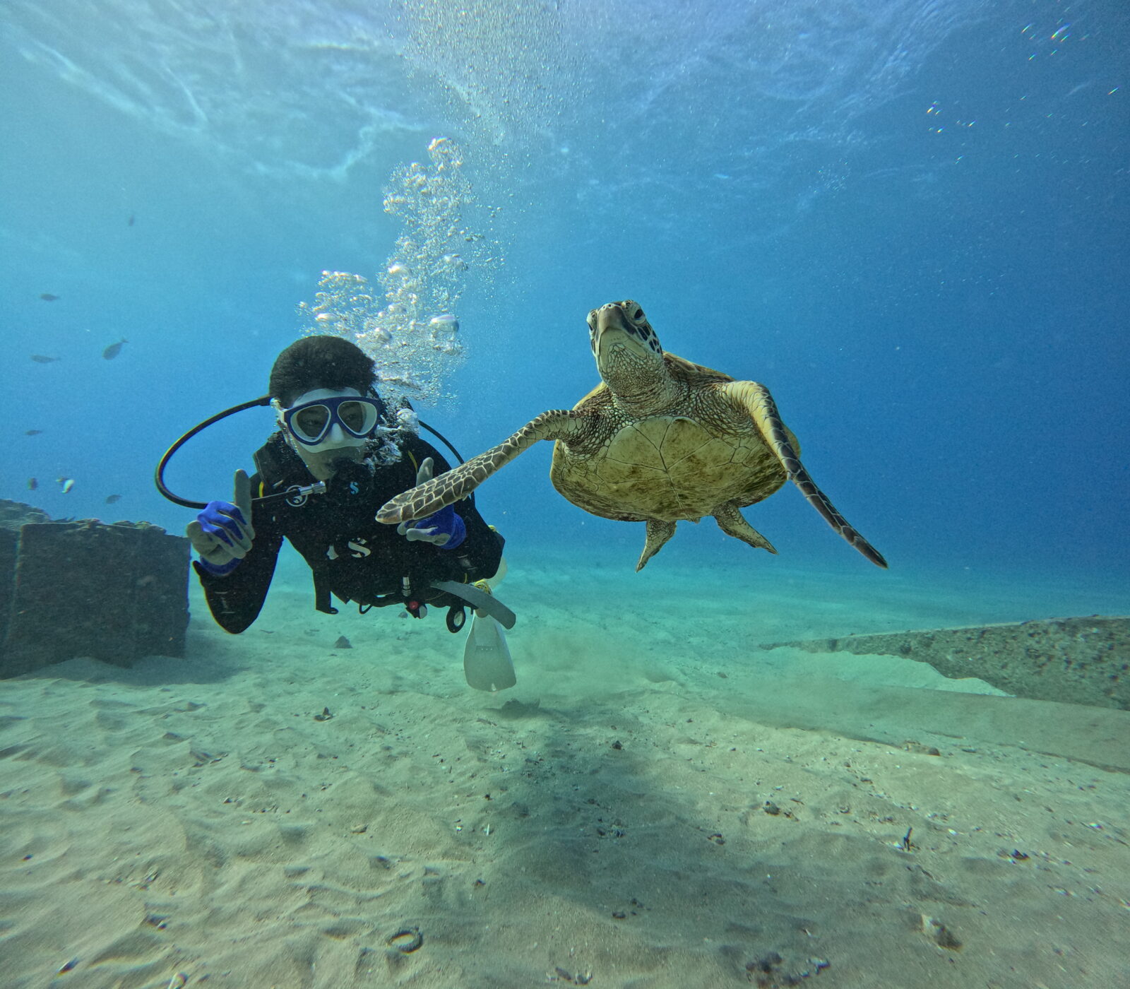 小ぶりなホヌ様とは、一緒に泳いで2ショットをゲット!