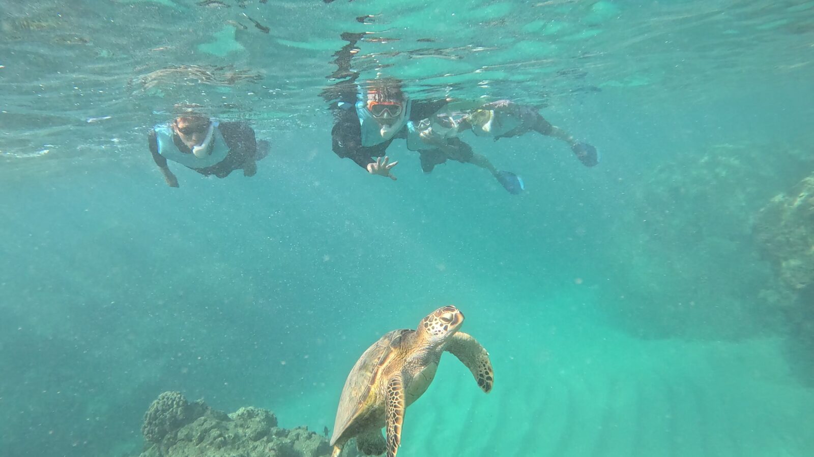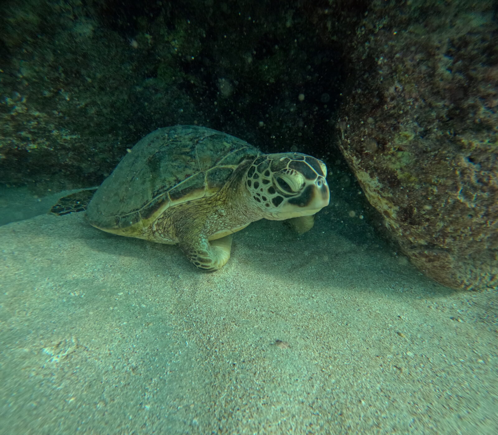皆さん上手だったので、ハナウマ湾の沖合へ少し出ると… 岩陰で休んでいるホヌ様発見!