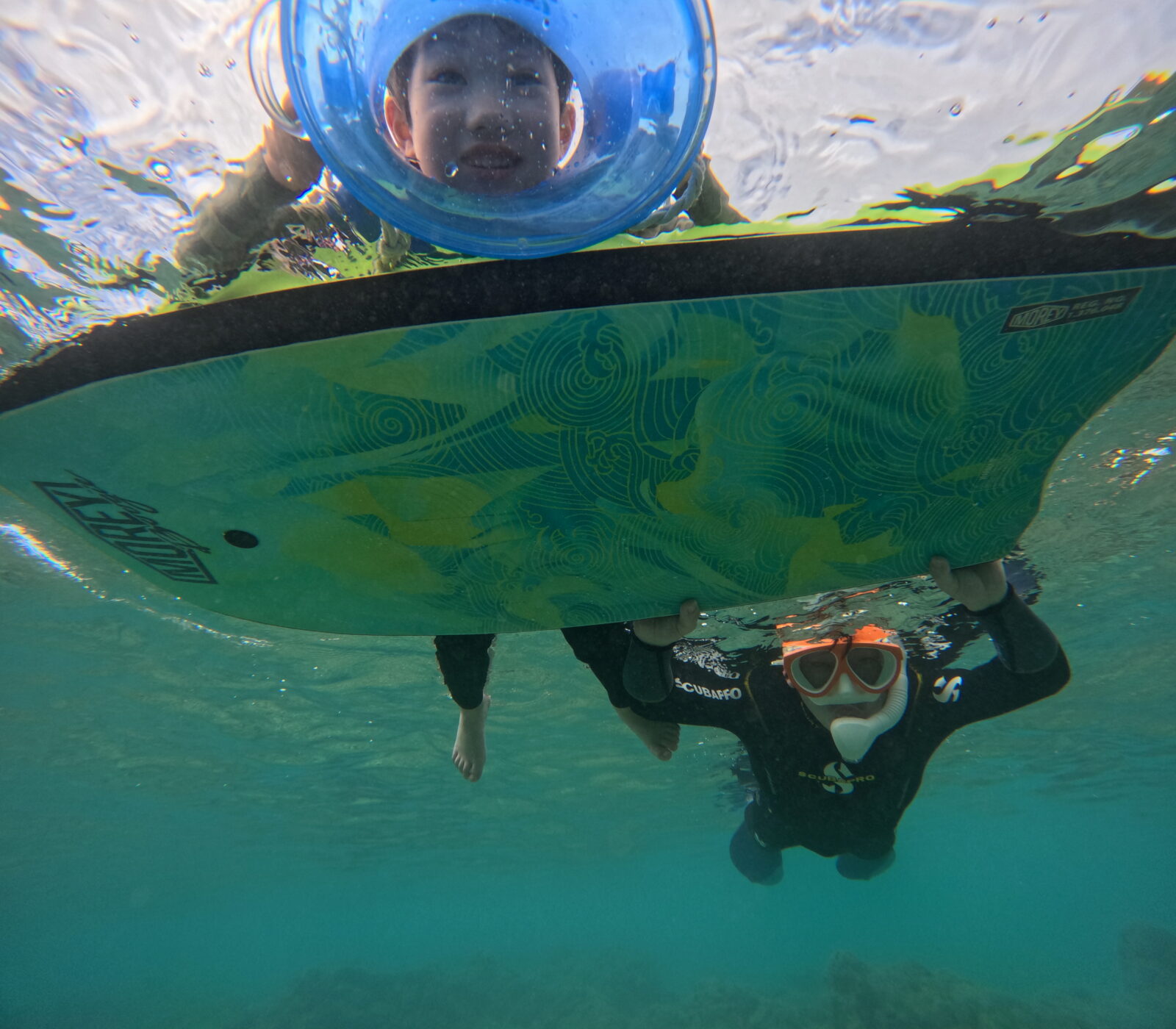 水慣れが心配だった6歳息子くん、まずはボードの上から箱メガネでお魚観察!
