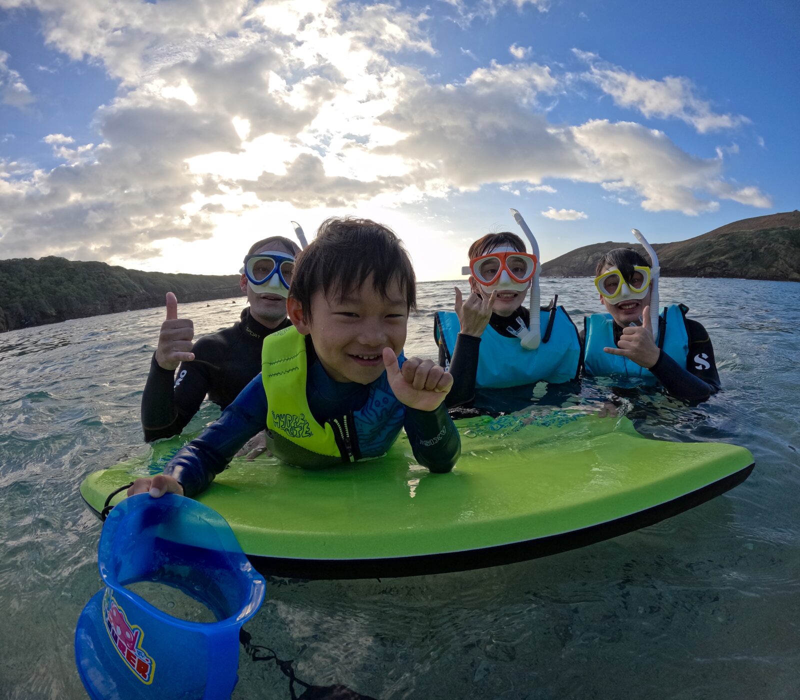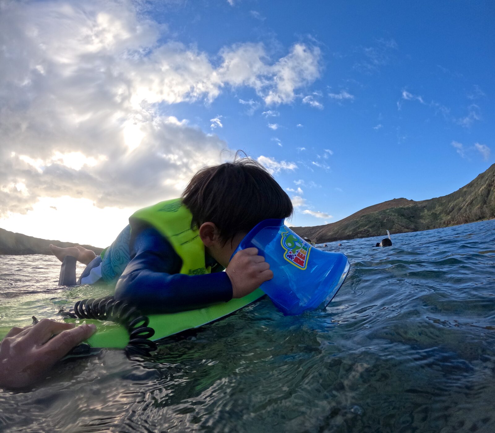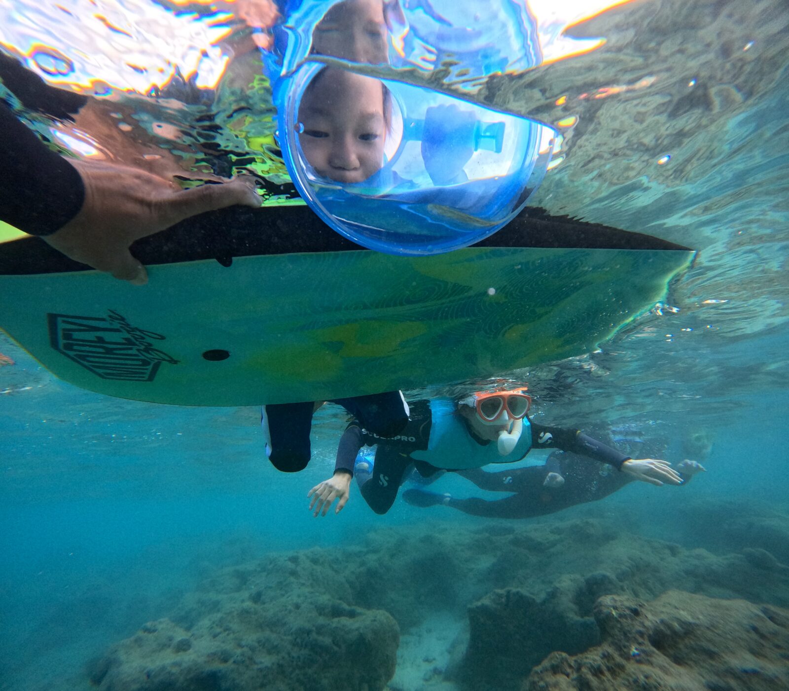 5歳の息子くんの初めてのシュノーケルは、ボードの上から箱めがねで挑戦!