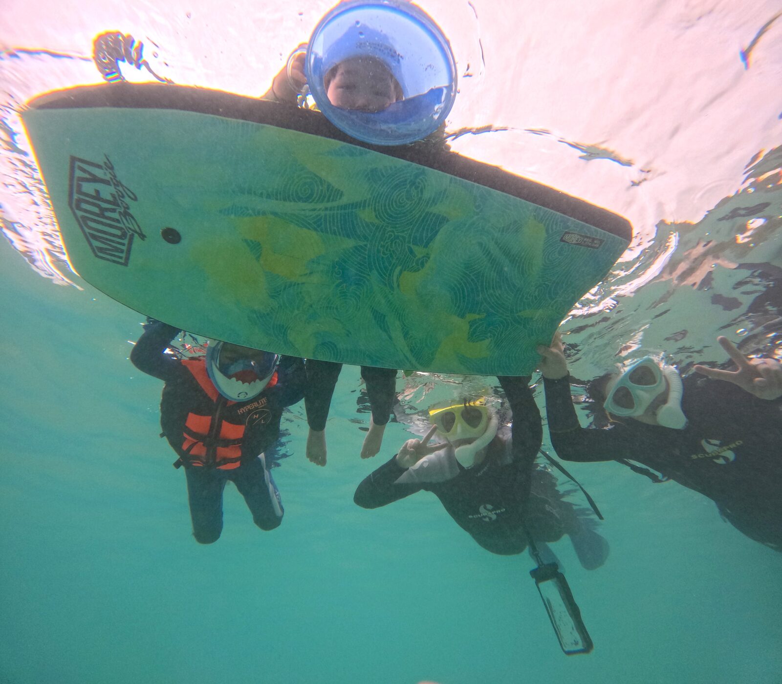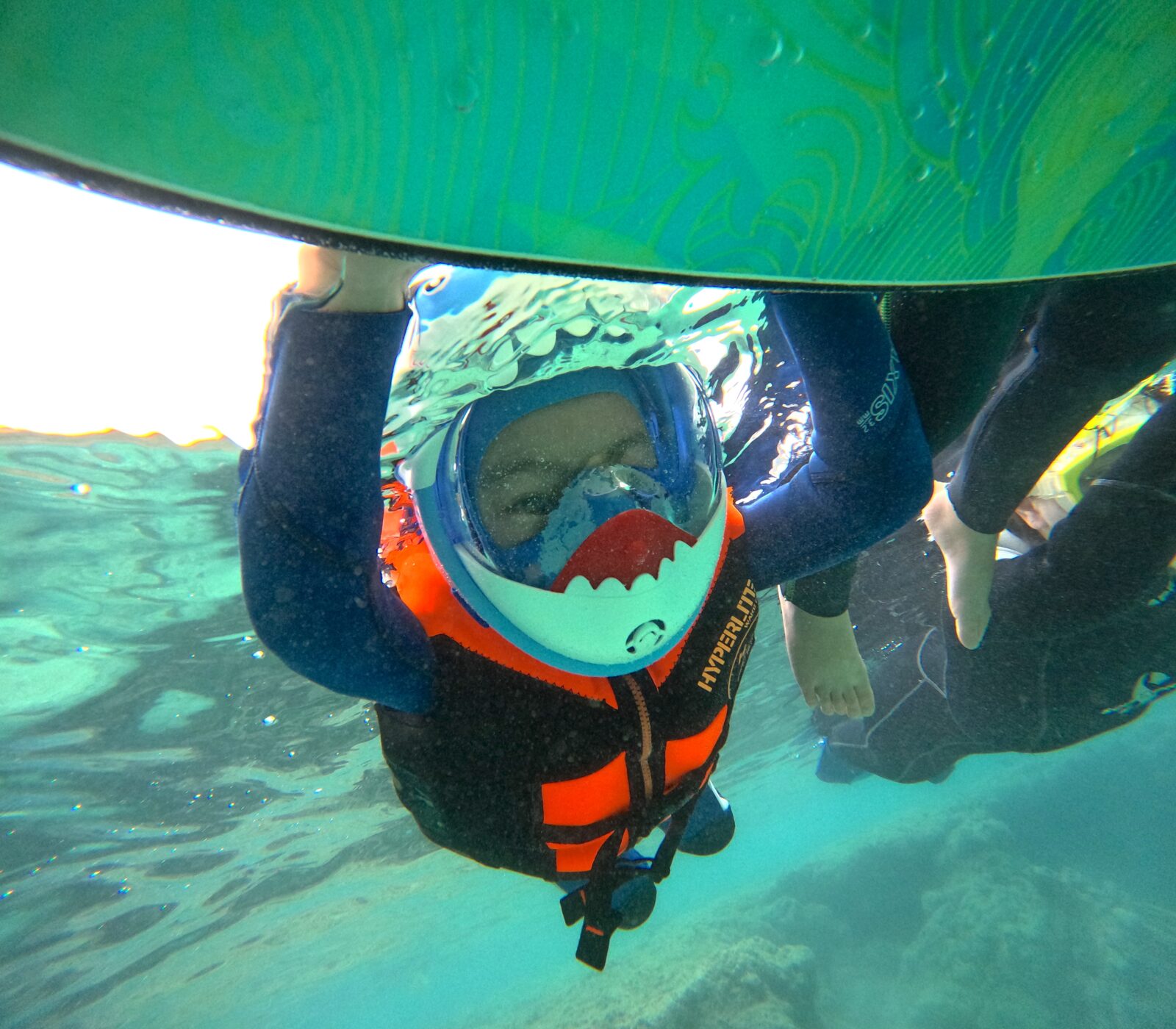 水慣れができている7歳お兄ちゃんは、フルフェイスマスクで!水慣れがまだの4歳弟君は、ボードの上から箱メガネで参戦!